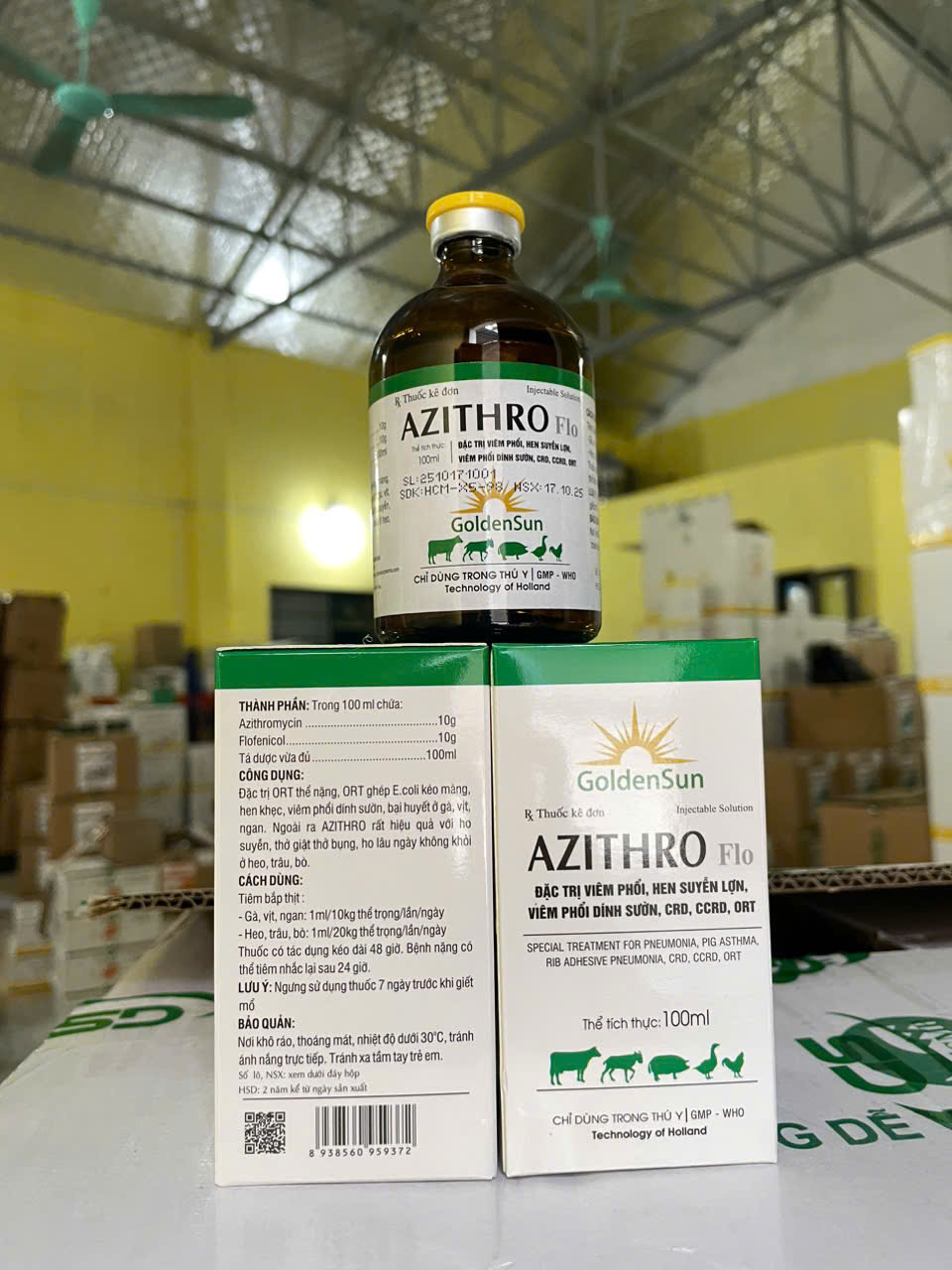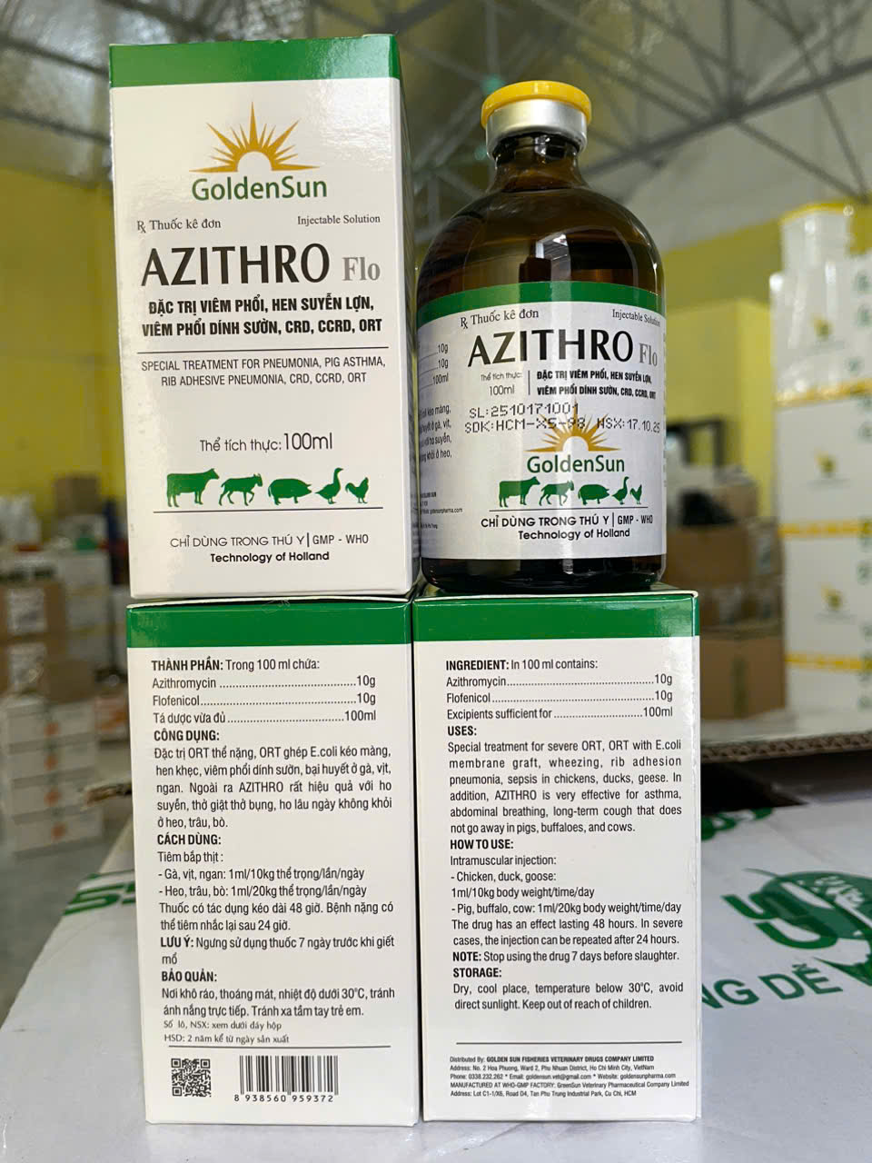 - Đặc trị ORT thể nặng, ORT ghép E.coli kéo màng, hen khẹc, viêm phổi dính sườn, bại huyết ở gà, vịt, ngan. Ngoài ra AZITHRO rất hiệu quả với họ suyễn, thở giật thở bụng, họ lâu ngày không khỏi ở heo, trâu, bò.