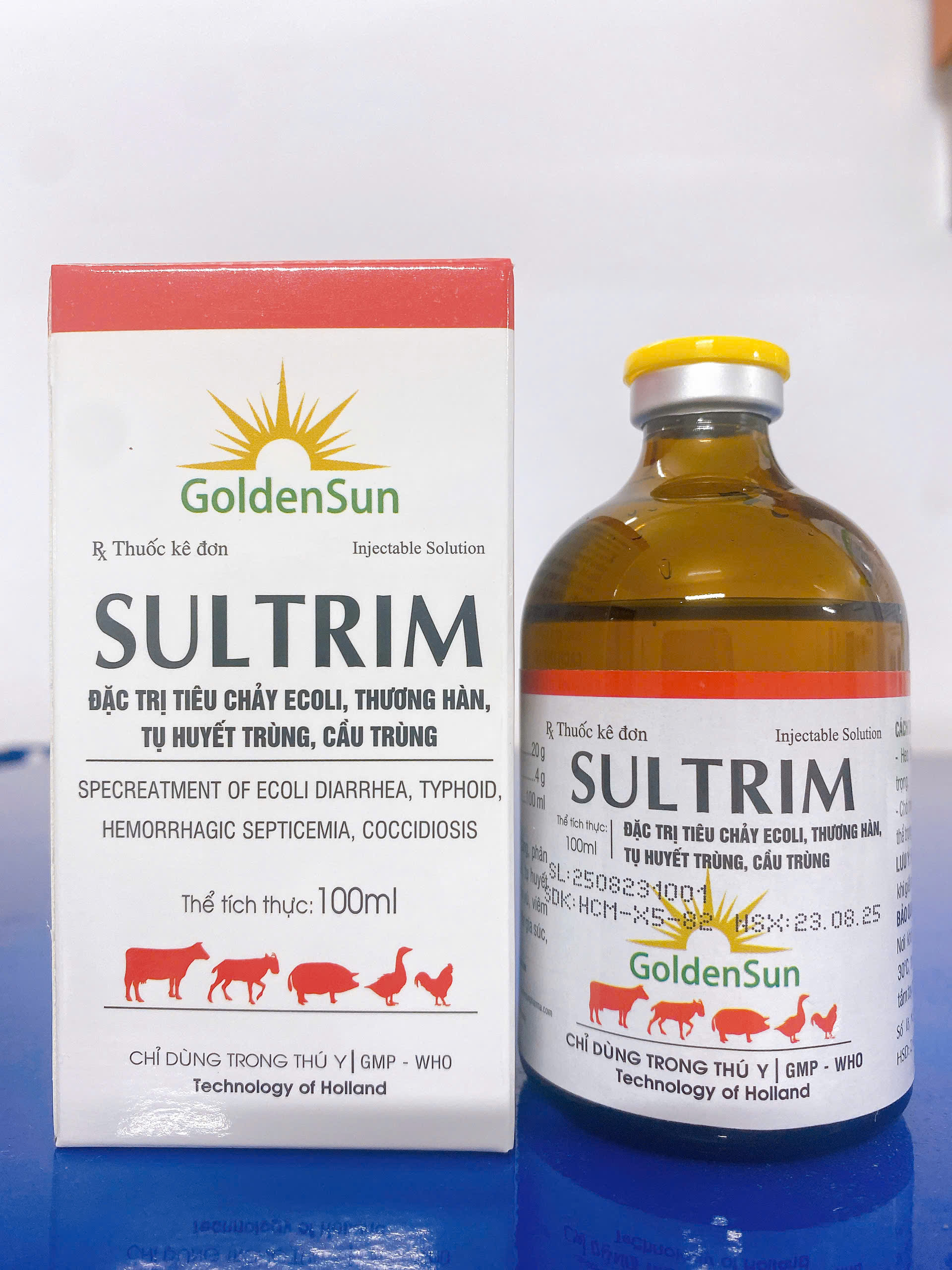 - Đặc trị viêm ruột, tiêu chảy phân trắng, phân xanh, phân vàng, thương hàn, E.coli, tụ huyết trùng, viêm phổi, viêm tử cung, viêm vú, viêm khớp, đau móng, nhiễm trùng máu trên gia súc, gia cầm.